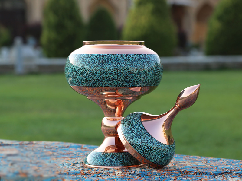 شکلات خوری فیروزه کوب با ارتفاع 30 سانتی متر از بدنه مسی و فیروزه های تزئینی زیبا ساخته شده است. این محصول که از ارزنده ترین صنایع دستی محسوب می شود، به دست هنرمندان بزرگ این مرز و بوم ایجاد شده است. آنچه این شکلات خوری مس و فیروزه را مهم نشان داده است، ظرافت بالا در طراحی است. کاربرد: شکلات خوری 9 فیروزه کوب وسیله ای کاربردی است که جهت پذیرایی از مهمانان مورد استفاده قرار می گیرد. می توانید انواع آجیل، خشکبار و شکلات را داخل این شکلات خوری قرار داده و از آن برای ایجاد حس احترام و ارزش به مهمانان استفاده کنید. ظاهر هنری و زیبای شکلات خوری فیروزه کوب باعث شده از این محصول برای زینت بخشیدن به فضای داخل منزل بهره برد. رنگ زیبای فیروزه به سرعت توجه افراد را به خود جلب می کند. همچنین از دیگر کاربردهای فوق العاده شکلات خوری  فیروزه کوب، استفاده از آن به عنوان هدیه است. برای هدیه روز مادر، روز ازدواج و حتی جهزیه عروس، چه چیز بهتر از یک محصول مانند شکلات خوری فیروزه کوبی! این هدیه تا ابد در خاطر عزیزانتان ثبت خواهد شد. شیوه تولید: در گام اول، هنرمندان مس خام را برش می دهند. سپس در ضخامت مشخصی با استفاده از دستگاه به فرم دلخواه ساخته می شود. سپس زیر دست نقاشان، با استفاده از قلموهای ظریف و رنگ های شاد، هنر میناکاری در نهایت دقت و ظرافت روی ظرف اجرا می شود. روکش پلی استر آلمانی در 4 مرحله، تمام سطح شکلات خوری را پوشانده است. این عمل باعث میشود از سیاه شدن محصول جلوگیری شود. این امر محصول را در برابر اکسیدن شدن و لَب پر شدن مقاوم کرده است. شکلات خوری مسی کاملاً دست ساز است. روش نگهداری: شکلات خوری مس و پرداز به شکلی تولید شده است که مقاومت بالایی در برابر ضربه دارد. اما این موضوع را باید مورد توجه قرار داد که این محصول در برابر نور مستقیم آفتاب و رطوبت تغییر رنگ می دهد. همچنین برای تمیز کردن شکلات خوری مسی فقط از به یک دستمال خشک (بدون استفاده از آب) استفاده کنید.